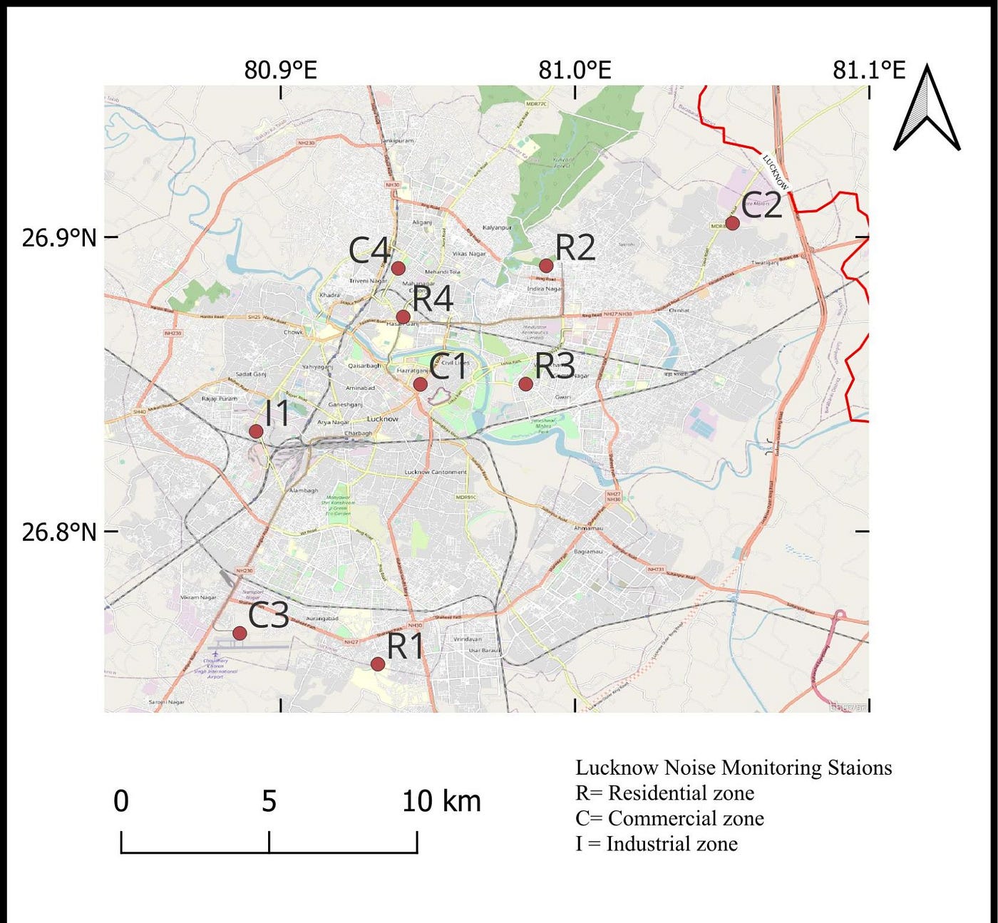 Map of the Noise monitoring stations in Lucknow is as follows: